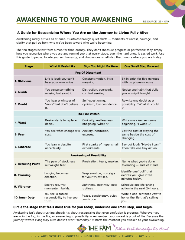 She was buried—under exhaustion, pressure, and the daily patterns that keep so many of us from feeling alive. She was near her breaking point. And she’s not alone. Members of The FAM have written to me sharing that familiar ache.